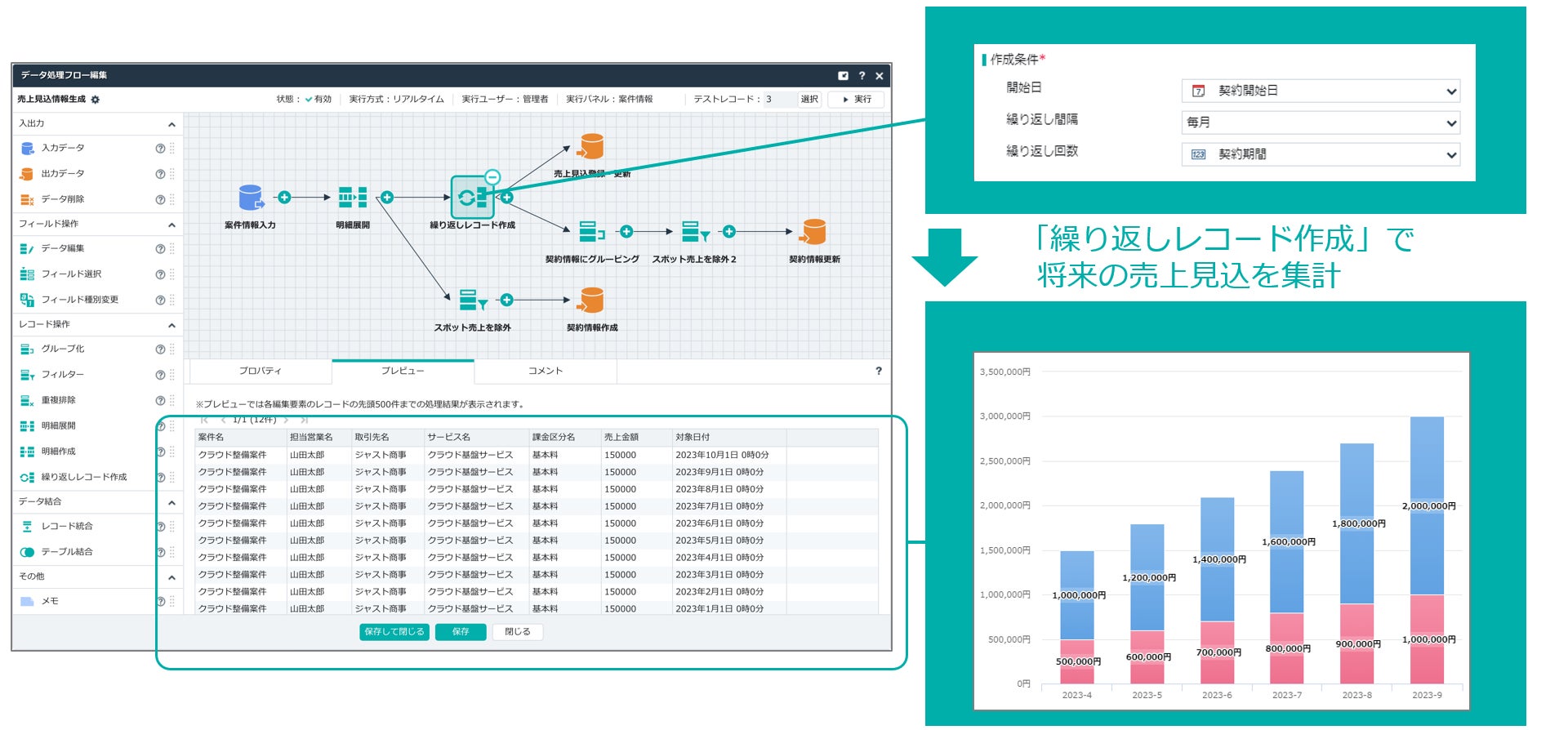 お客様ごとの契約期間や、売上処理の間隔に応じた明細データを簡単に作成できる「繰り返しレコード作成」機能を新たに搭載しました。サブスクリプション型ビジネスの集計に必要なレコードの一括生成により、これまでの煩雑な作業が不要で、将来の売上見込を把握できます。また、生成したレコードの特定フィールドを直接編集できる「インライン編集」機能も搭載しました。これらの機能により、サブスクリプション契約の顧客台帳を作るだけで、正確な売上集計や案件管理、精度の高いフォーキャストの確認が可能となります。