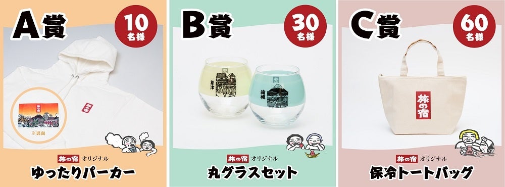 昨年好評をいただいた「『旅の宿』の世界にどっぷりつかろう オリジナルグッズプレゼントキャンペーン」が、1年ぶりに帰ってきました。今年は、温泉旅行や街歩きにもおススメの「ゆったりパーカー」や、お風呂上がりの一杯に愛用したい「丸グラスセット」、ワンポイントのブランドロゴが映える「保冷トートバッグ」など、「旅の宿」の版画の世界をたっぷり楽しめるオリジナルグッズをご用意しました。これらに、「旅の宿 こだわりアソート」[医薬部外品]と「ナイーブ 旅の宿ボディソープ」をセットにして、抽選で100名様にプレゼントいたします。