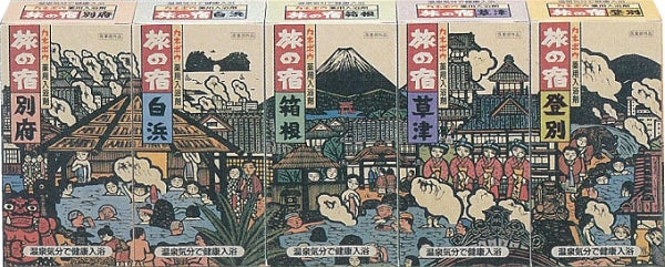 1986年に最初に発売された「旅の宿」は、北海道から九州まで、日本全国の人気温泉地「登別」、「草津」、「箱根」、「白浜」、「別府」の5種類。その5つのパッケージを並べると木田安彦氏による1枚の版画になる、遊び心あふれる仕掛けになっていました。日本全国の温泉地を巡る楽しさと、日本ならではの情緒が表現された版画のパッケージは、「旅の宿」ブランドの大切な財産です。