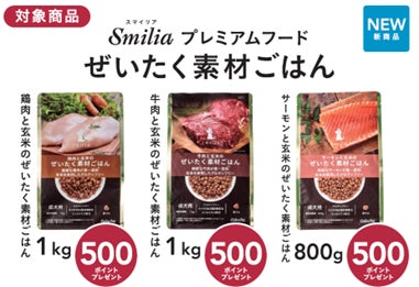 カインズオリジナルのプレミアムドッグフード「スマイリア ぜいたく素材ごはん」シリーズの発売を記念して、カインズ会員様限定のポイントプレゼントキャンペーンを開催します。