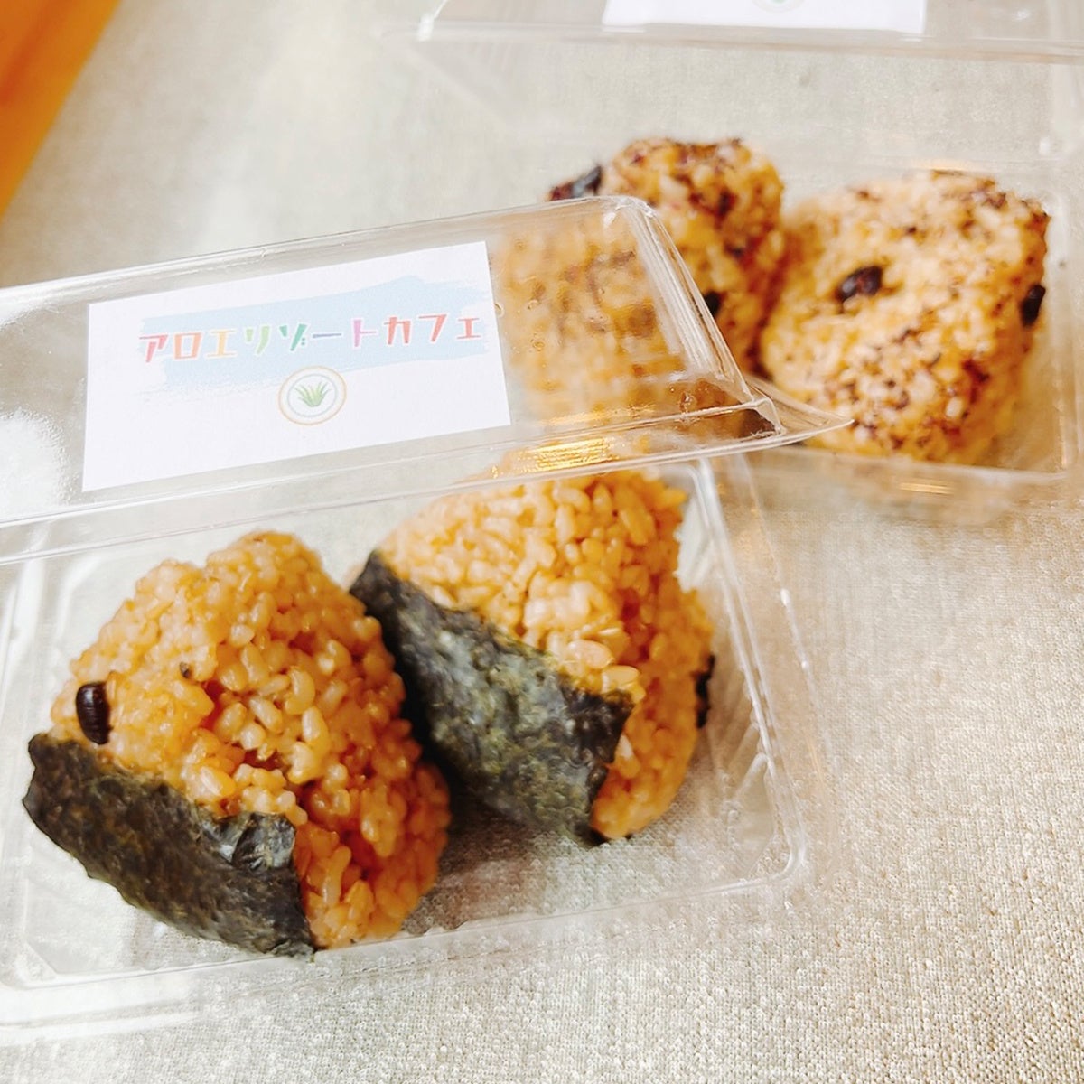 身体が喜ぶ酵素玄米おにぎりを、自家米ひとめぼれで各種提供!さらに、野菜としてのアロエベラも知っていただきたいとの思いで、副菜として提供!ぜひご賞味を。