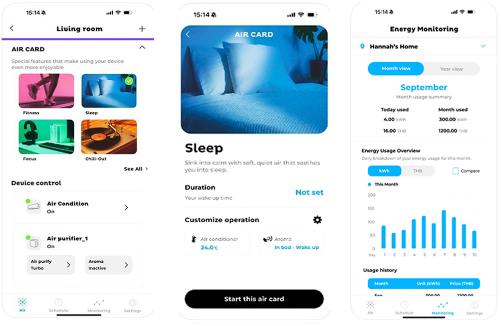 本アプリの特長は、迷わず使える操作性にあります。ユーザー自身が選択できるカスタマイズ可能なUI(ユーザーインターフェース)をはじめ、室温や空気の状態も一目で把握可能です。複数台の機器をまとめて管理・連動制御が可能なため、機種によっては、リラックス、睡眠等の生活シーン別の制御を実現できます。