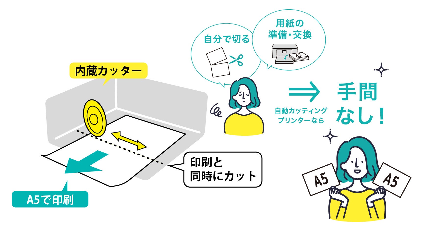 A4用紙をセットして印刷すると、印刷と同時に自動的に半分のA5サイズにカットすることが可能。カット機能を使用せずにA4サイズで印刷することもできる。