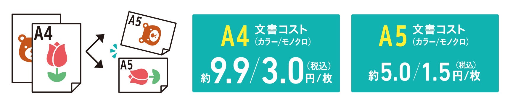 A4サイズの原稿をA5サイズに縮小印刷することで、用紙代やインクコストを約半分にカットできる。用紙やインクの使用量が減り、資源の節約にもつながる。