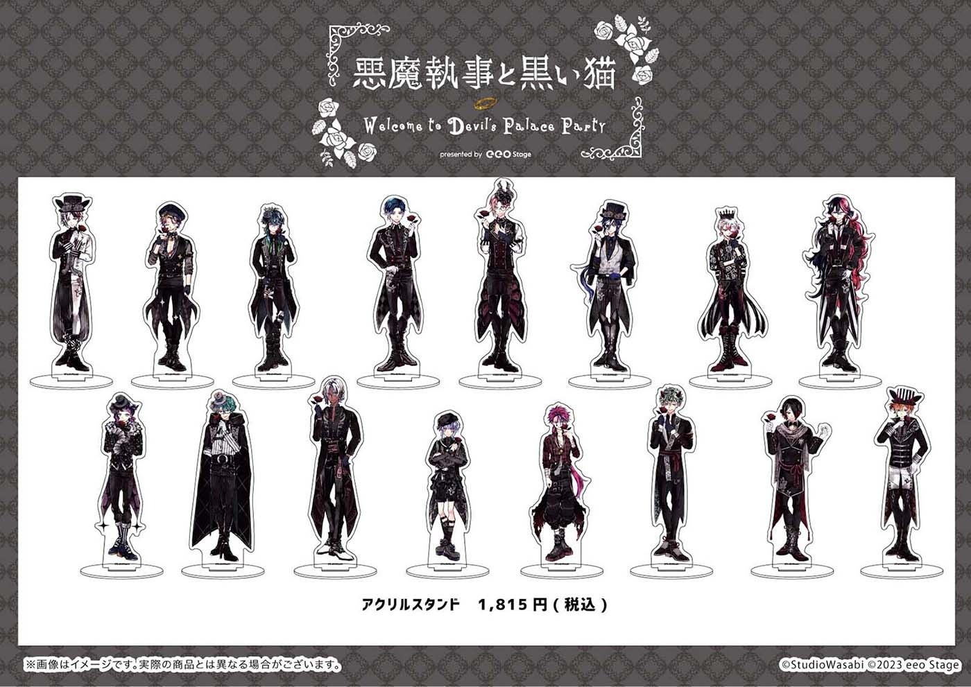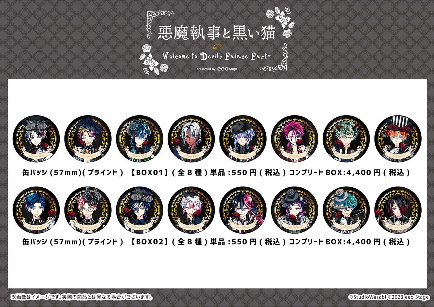 今回発売される新作グッズは9アイテム85種! 定番グッズの缶バッジからアクリルスタンド、缶入り金平糖、パンフレットなどイベント「『悪魔執事と黒い猫』 ~Welcome to Devil’s Palace Party~」の開催をお祝いするのにピッタリのアイテムが勢ぞろいしています。