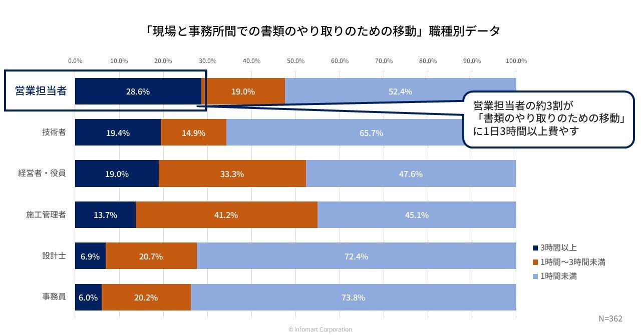 また、職種別に見てみると、28.6%の営業担当者が「現場と事務所間での書類のやり取りのための移動」に3時間以上費やしていると回答し、紙が故の無駄な移動時間が発生している実態が明らかになりました。