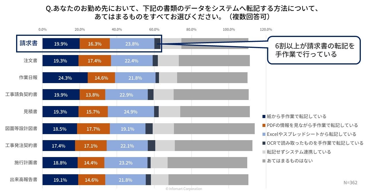 今回の調査結果では、建設業において各種書類の受け渡しに紙を使う割合が最も多いことがわかり、紙文化が根強く残る現状が浮き彫りとなりました。また、システムへの転記作業に関しては、Excelやスプレッドシートからの転記が最も多い結果となりました。その中でも請求書を手作業で転記する割合が約6割と最も高いことが分かりました。