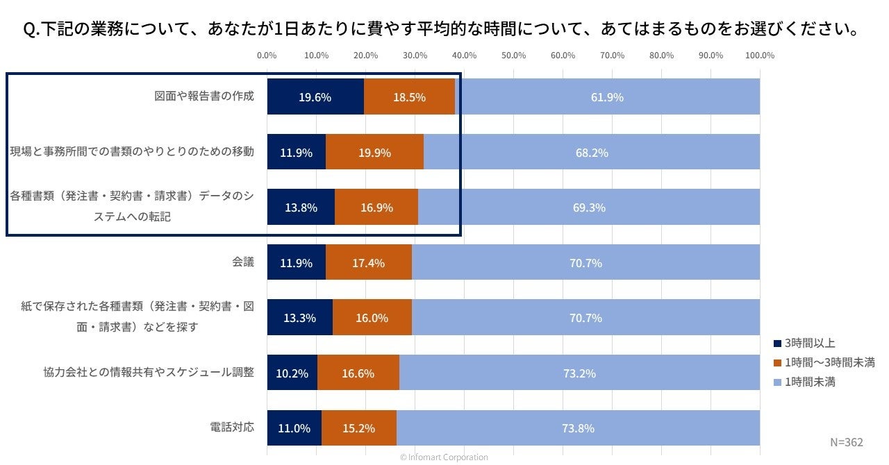 各種業務に対して1日に費やす時間について聞いてみると(n=362)、かける時間が多い順に「図面や報告書の作成(38.1%)」、「現場と事務所間での書類のやり取りのための移動(31.8%)」、「各種書類データのシステムへの転記(30.7%)」という結果になりました。