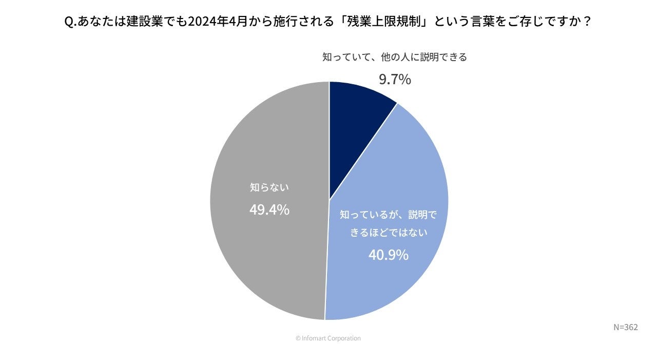 2024年4月から建設業でも適用される「残業上限規制(時間外労働の上限規制)」の認知度について聞いてみると(n=362)、「知っていて、他の人に説明できる」と回答した人は9.7%と1割に満たない結果となりました。その他「知っているが、説明できるほどではない(40.9%)」「知らない(49.4%)」と、制度の認知は半数に留まる結果となりました。
