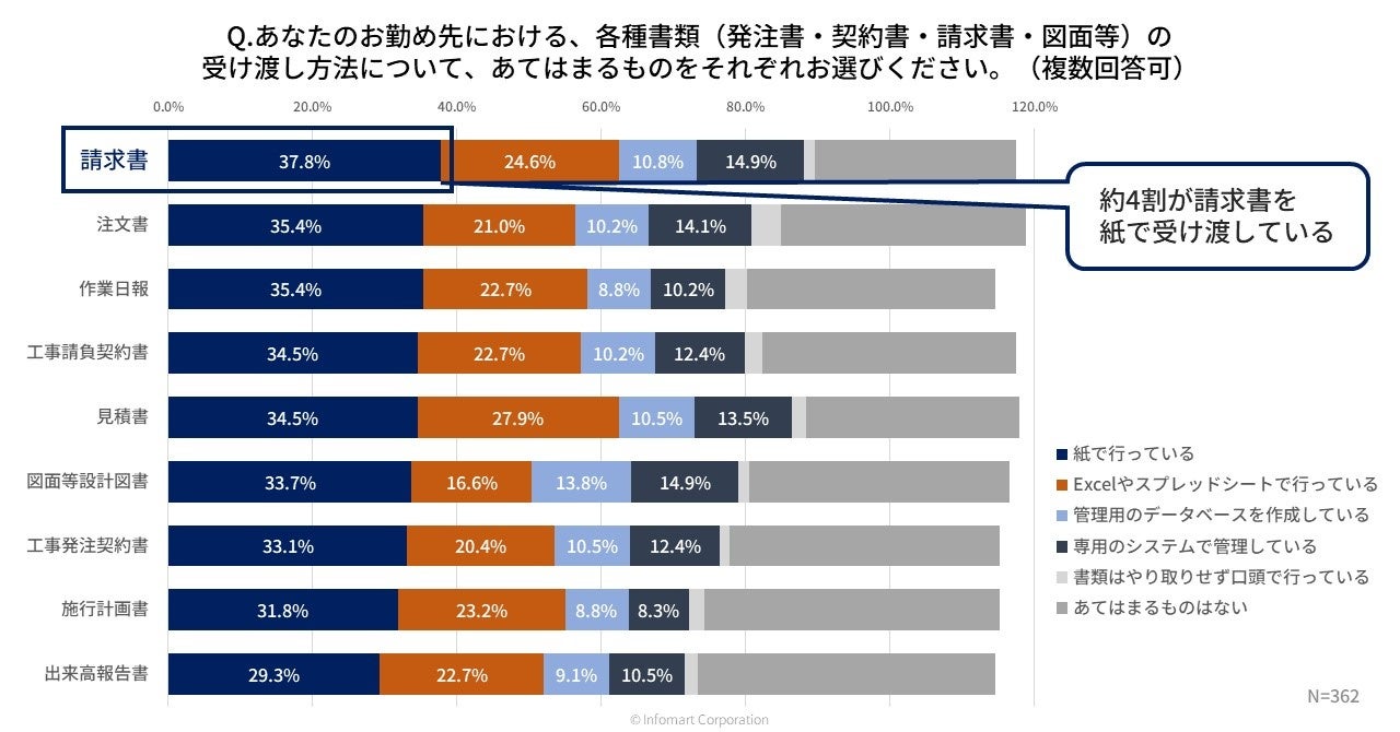 各種書類(発注書・契約書・請求書・図面等)の受け渡し方法について聞いたところ(n=362)、「紙で行っている」と回答した割合が約3割で最多となりました。次いで、「Excelやスプレッドシートで行っている」と約2割が回答しています。特に、請求書に関しては37.8%が「紙で行っている」と回答し、全ての書類の中でトップとなりました。