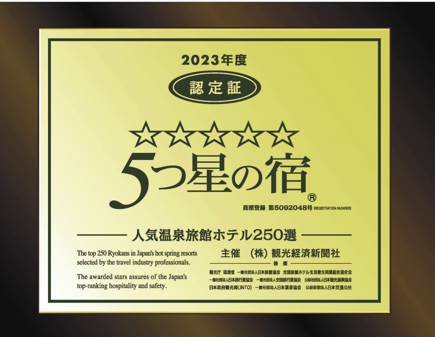 旅行会社社員など”旅のプロ”が選んだ温泉旅館ホテル250選です。観光経済新聞社主催にて、1年に1回実施、発表しています。 専用投票ハガキを全国の旅のプロに配布し、投票にご協力いただいており、その旅館・ホテルに投票した理由は「料理」「接客」「温泉浴場」「施設」「雰囲気」の5項目の中から選択されています。