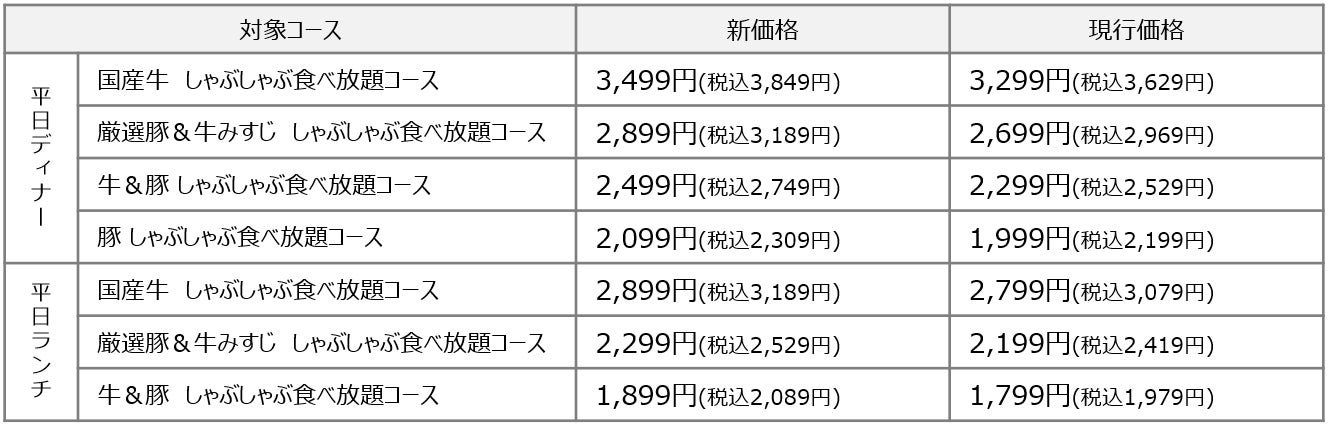以下食べ放題コースにおける価格を、2024年11月21日(木)より、下記の通り変更いたします。