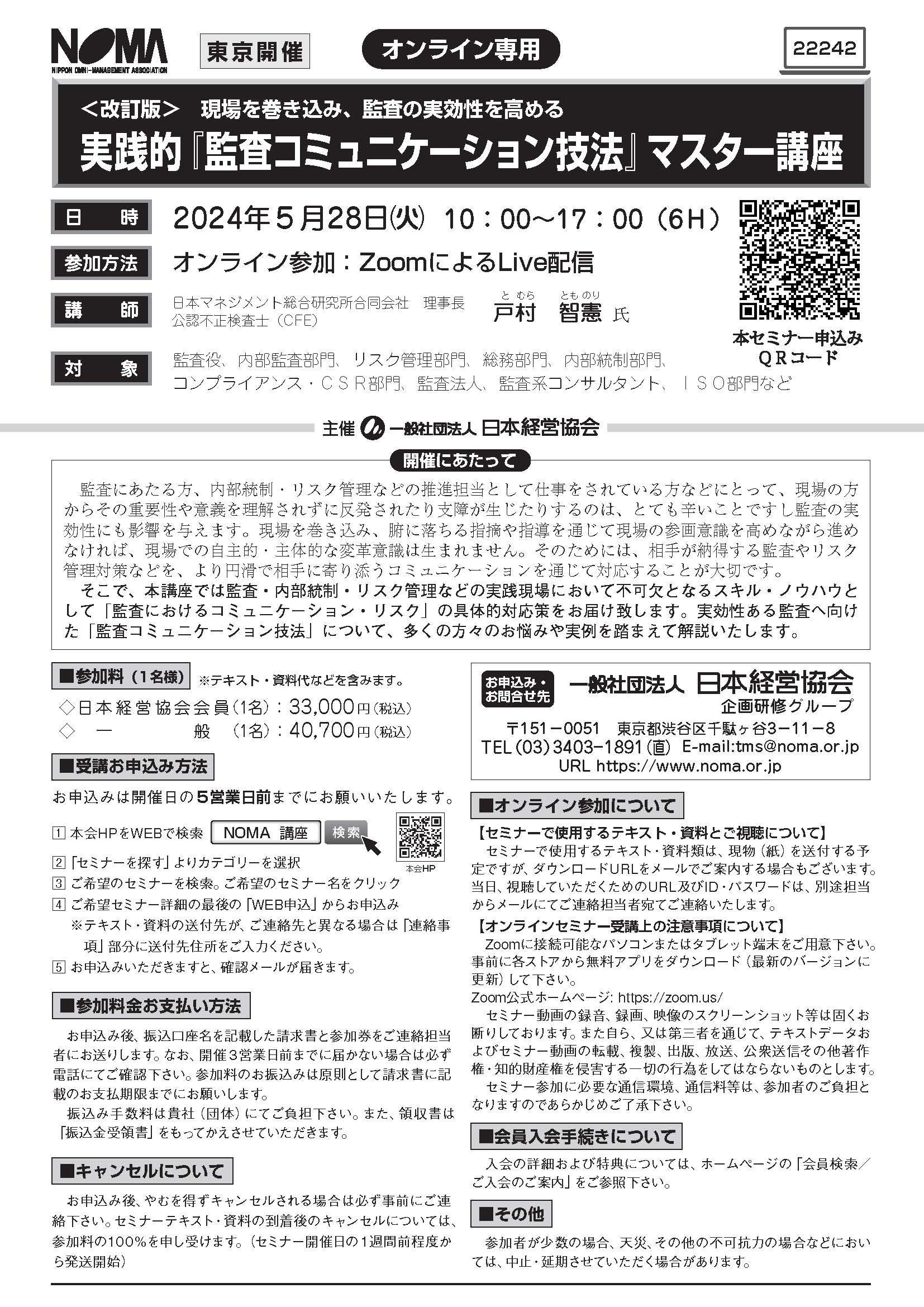 ・開催セミナー: 「実践的『監査コミュニケーション技法』マスター講座: 現場を巻き込み、監査の実効性を高める」