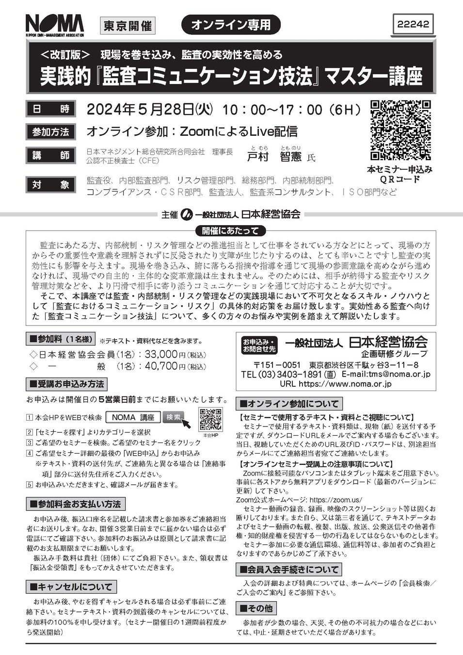監査コミュニケーション講座(オンラインZOOMライブ)2024年5月28日(火)AM10時~17時にて世界初の開発者で弊社理事長の戸村智憲が登壇致します【日本マネジメント総合研究所合同会社】