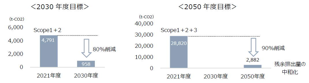| 2021年度総排出量を基準として、 ・2030年度までに、Scope1+2を80%以上削減 ・2050年度までに、カーボンネットゼロ達成(Scope1+2+3を90%以上削減、残余排出量の中和化※1) |