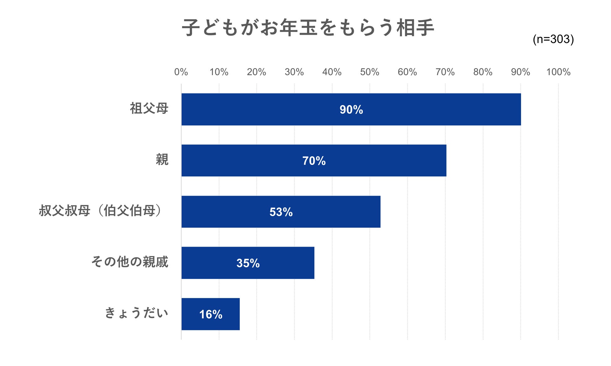 「祖父母」という回答が90%で、最多でした。お年玉という習慣は、「祖父母と孫」という世代間のつながりを象徴する役割にもなっていると考えられます。