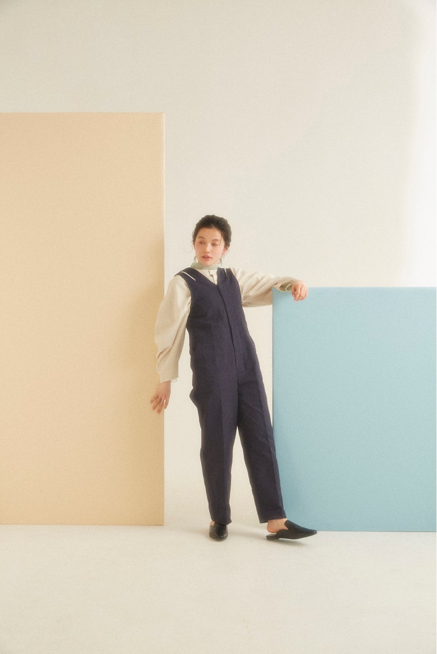 ハリ感のある素材できれいなシルエットのコンビネゾン。ブラウスなど、春のガーリートップスとのスタイリングもおすすめの1着です。