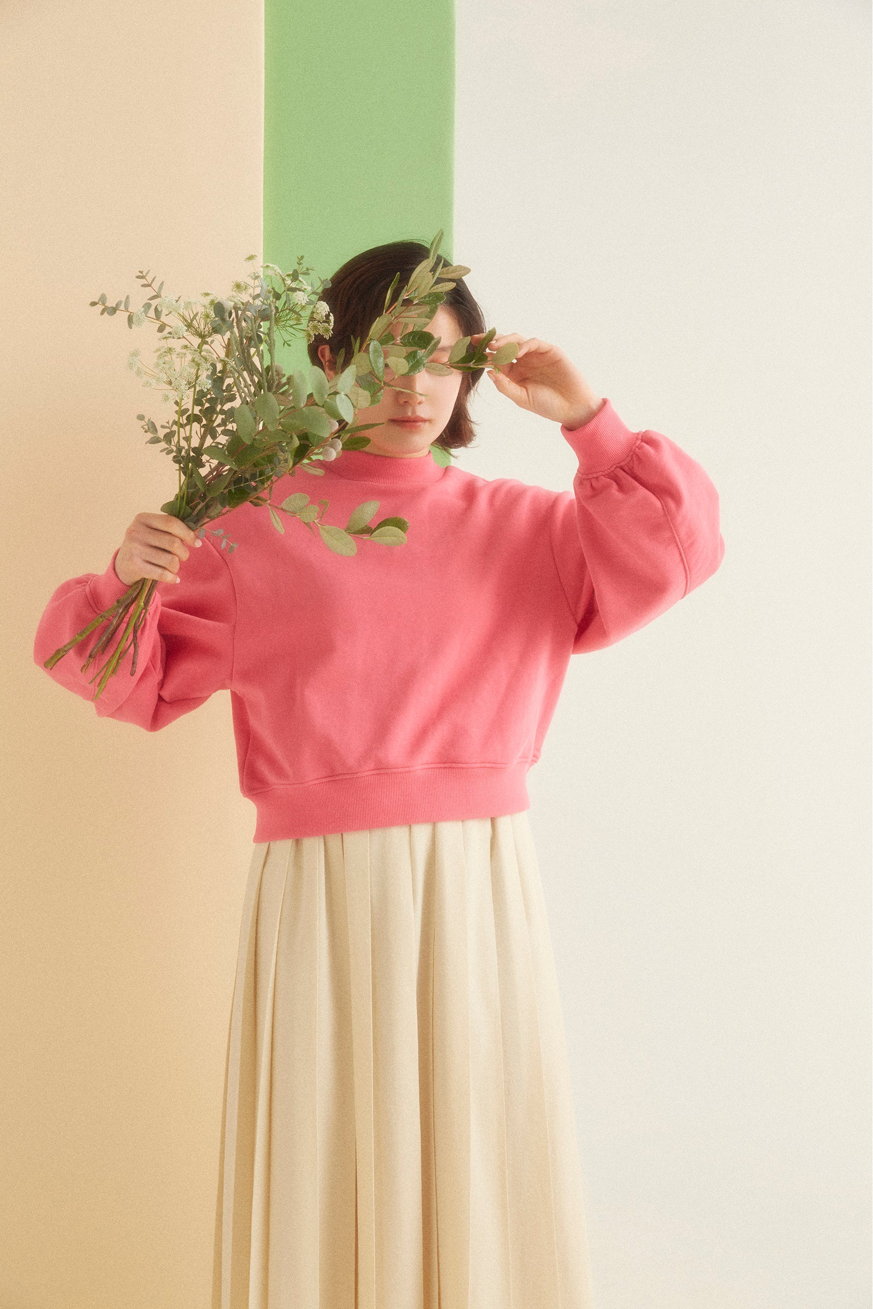 素材表面の毛羽を取ることで、キレイで上質な風合いに仕上げた裏毛プルオーバー。プチハイネックと春らしいカラー展開がポイントです。