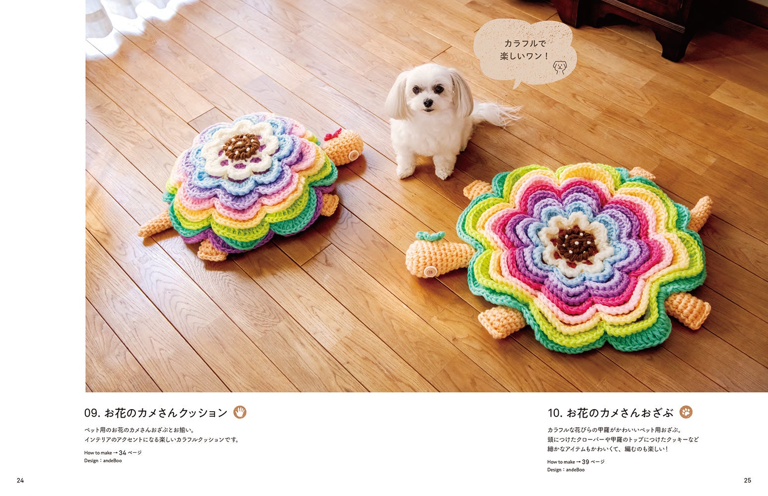 かぎ針で編む愛犬と愛猫のための、おざぶとんやペットハウスの作り方を解説する手芸書です。