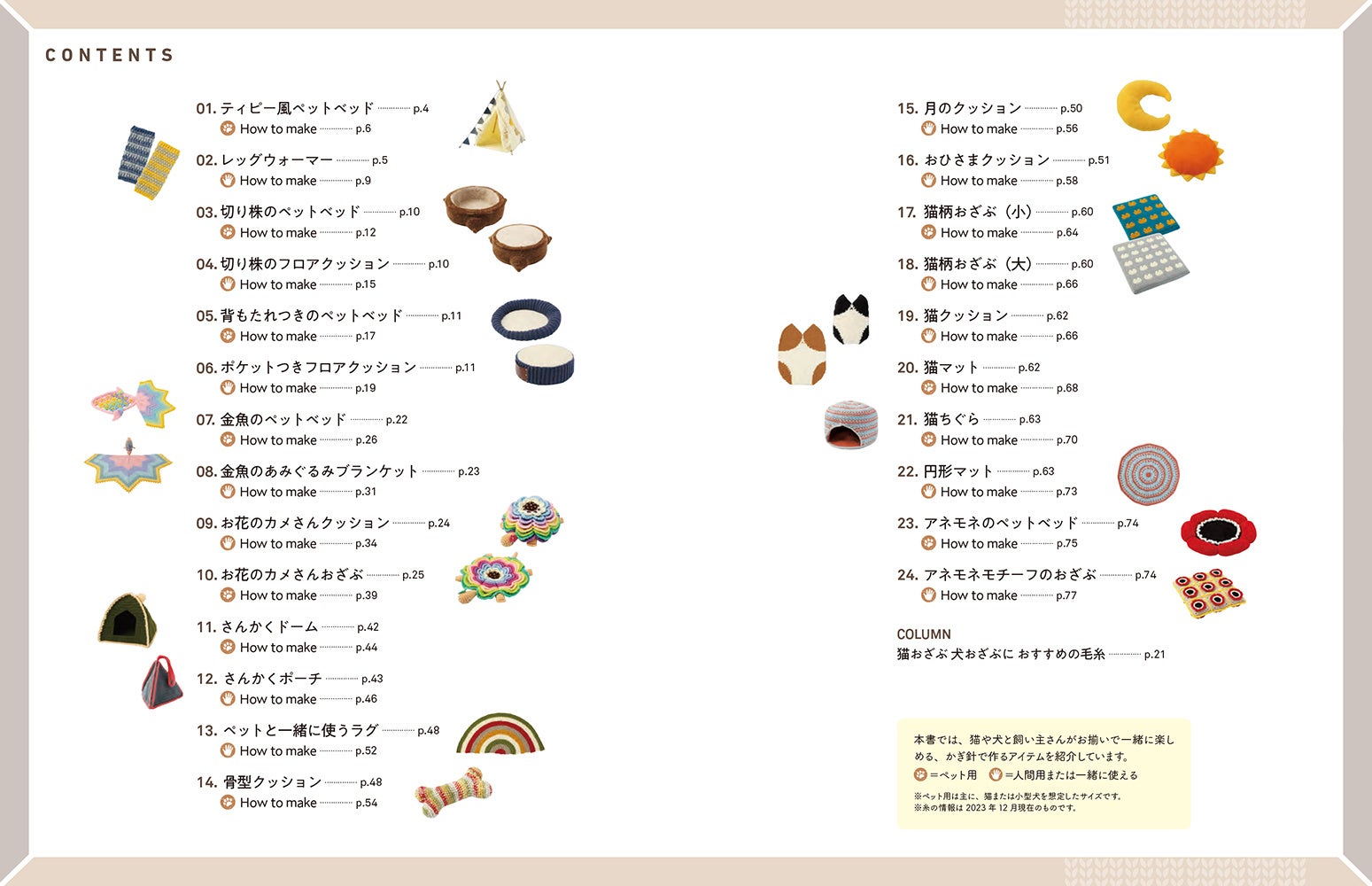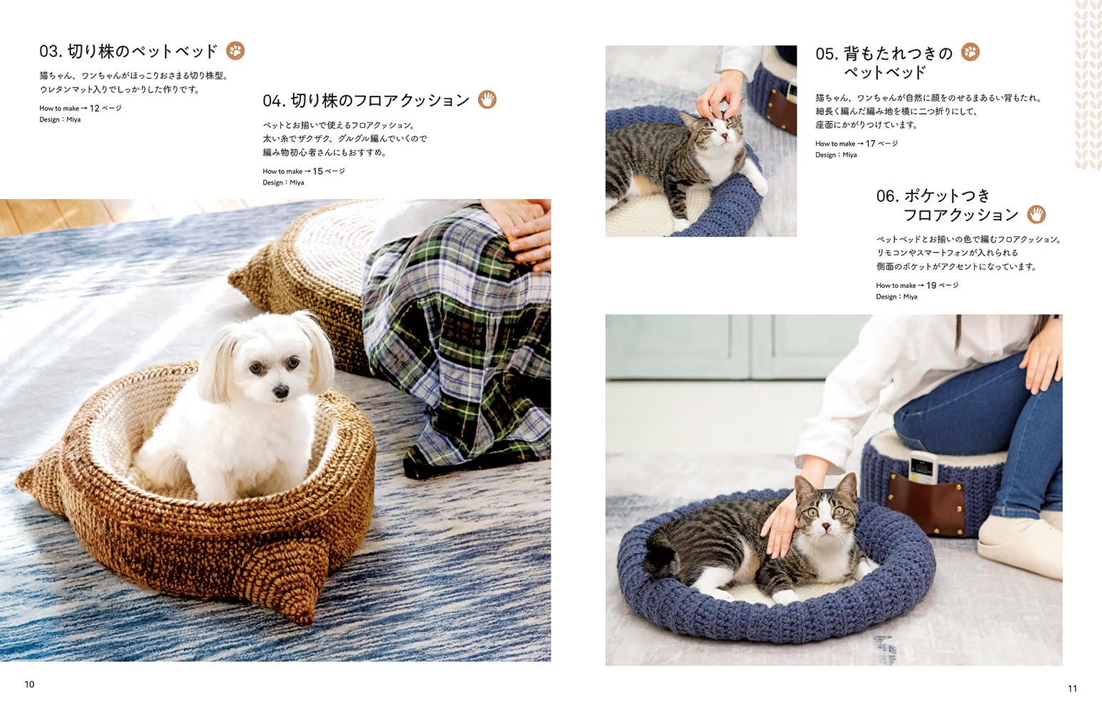 にゃんこやワンコがすっぽりおさまる大きなベットや、ちょこんと座れるクッション、飼い主さんとお揃いで一緒に使えるニット小物24点を紹介します。