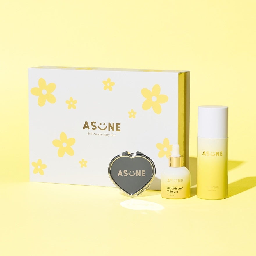 3周年を記念し、新商品「グルタチオン*¹Vセラム(美容液)」と待望のビタミン*²ミルク大容量サイズ、ASUNE オリジナルミラーがセットになったスペシャルアニバーサリーボックス!