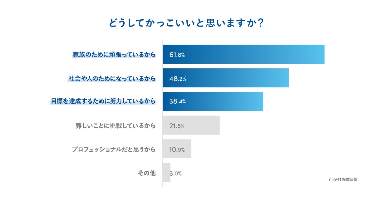 かっこいいと思う理由を聞いたところ、トップは「家族のために頑張っているから」で、「社会や人のためになっているから」「目標を達成するために努力しているから」が続きました。
