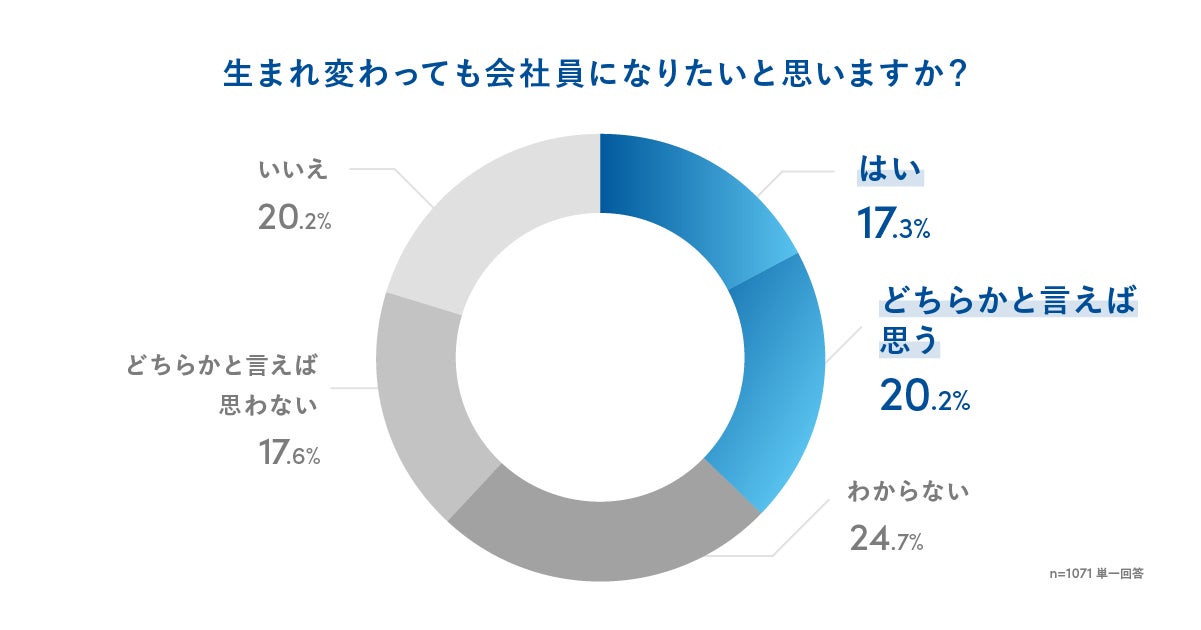 小さい頃から会社員になりたいと思っていたと回答した人は22.0%、どちらかと言えば思っていたと回答した人は14.2%でした。また、生まれ変わっても会社員になりたいと回答した人は17.3%、どちらかと言えば思うと回答した人は20.2%でした。