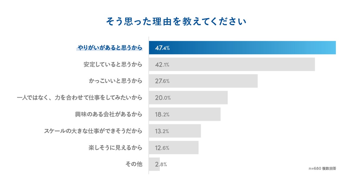 そう思った理由は「やりがいがあると思うから」がトップで、会社員が子どもたちから尊敬を集める存在であり、魅力ある仕事だと認識されていることがうかがえます。