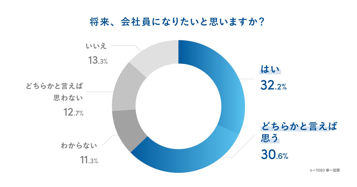 次に、自分も将来会社員になりたいと思うかを聞いたところ、合わせて60%以上が「はい」「どちらかと言えば思う」と回答しました。