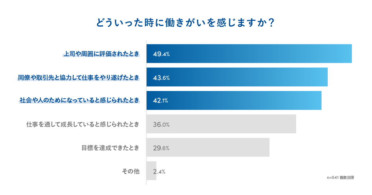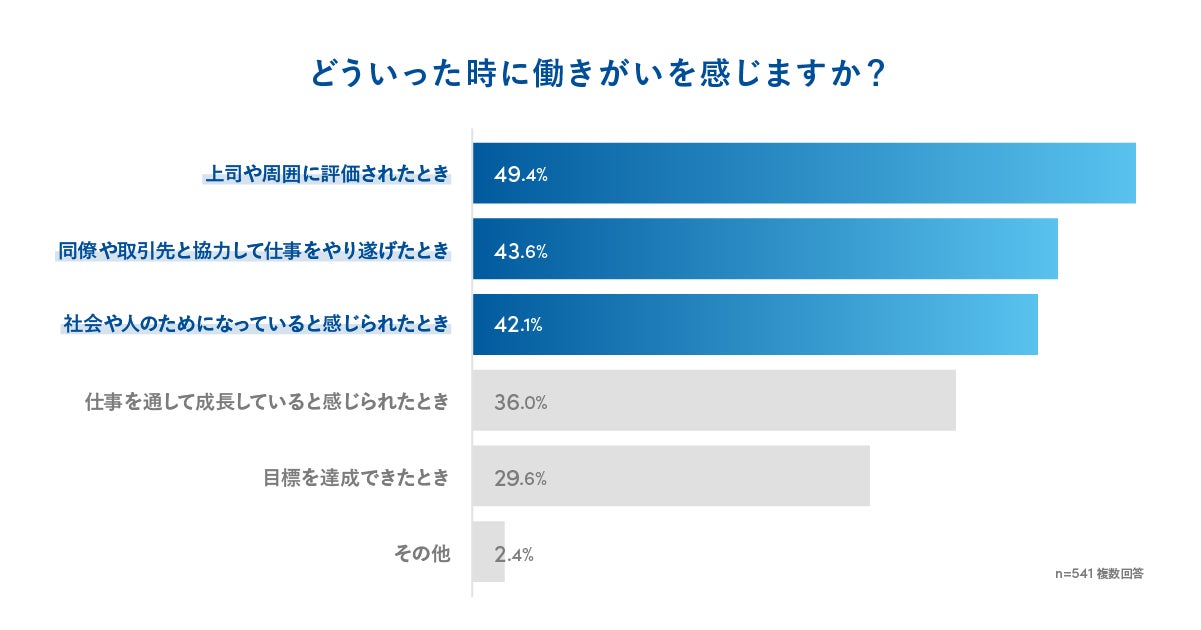 ・働きがいを感じるときは「上司や周囲に評価されたとき」「同僚や取引先と協力して仕事をやり遂げたとき」「社会や人のためになっていると感じられたとき」