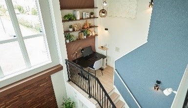 コロナ禍の在宅ワークで多く挙げられた、「リビングに近過ぎず、かつ家族と分断されない場所」へのニーズを満たすべく、立体的な空間の活用により、適切な距離を確保。さらに、公園ビューと柔らかい自然光により、集中力や知的創造力を高め、1,2階の行き来だけではなく、移動の中に新たな目的を加えることで運動習慣を活性化。