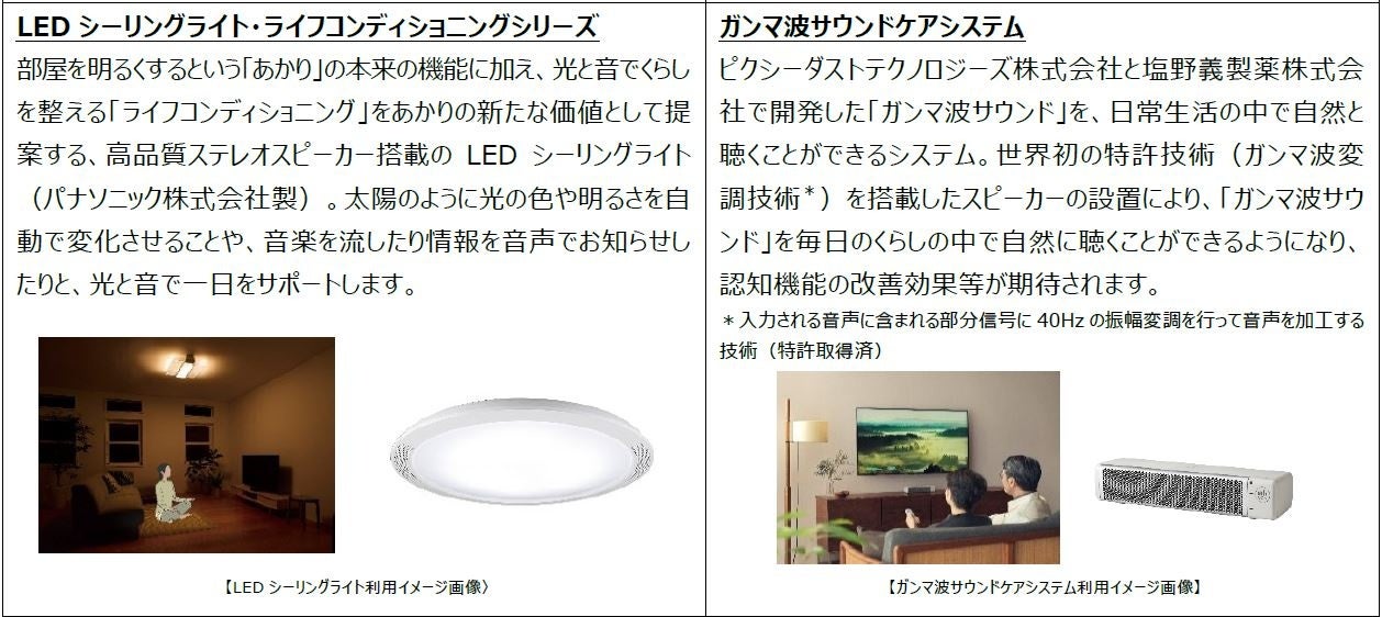 「高品質ステレオスピーカーライト搭載のLEDシーリングライトを用いた五感覚醒の癒し空間」など、一室でオンとオフの切り替えや多用途での活用が可能。