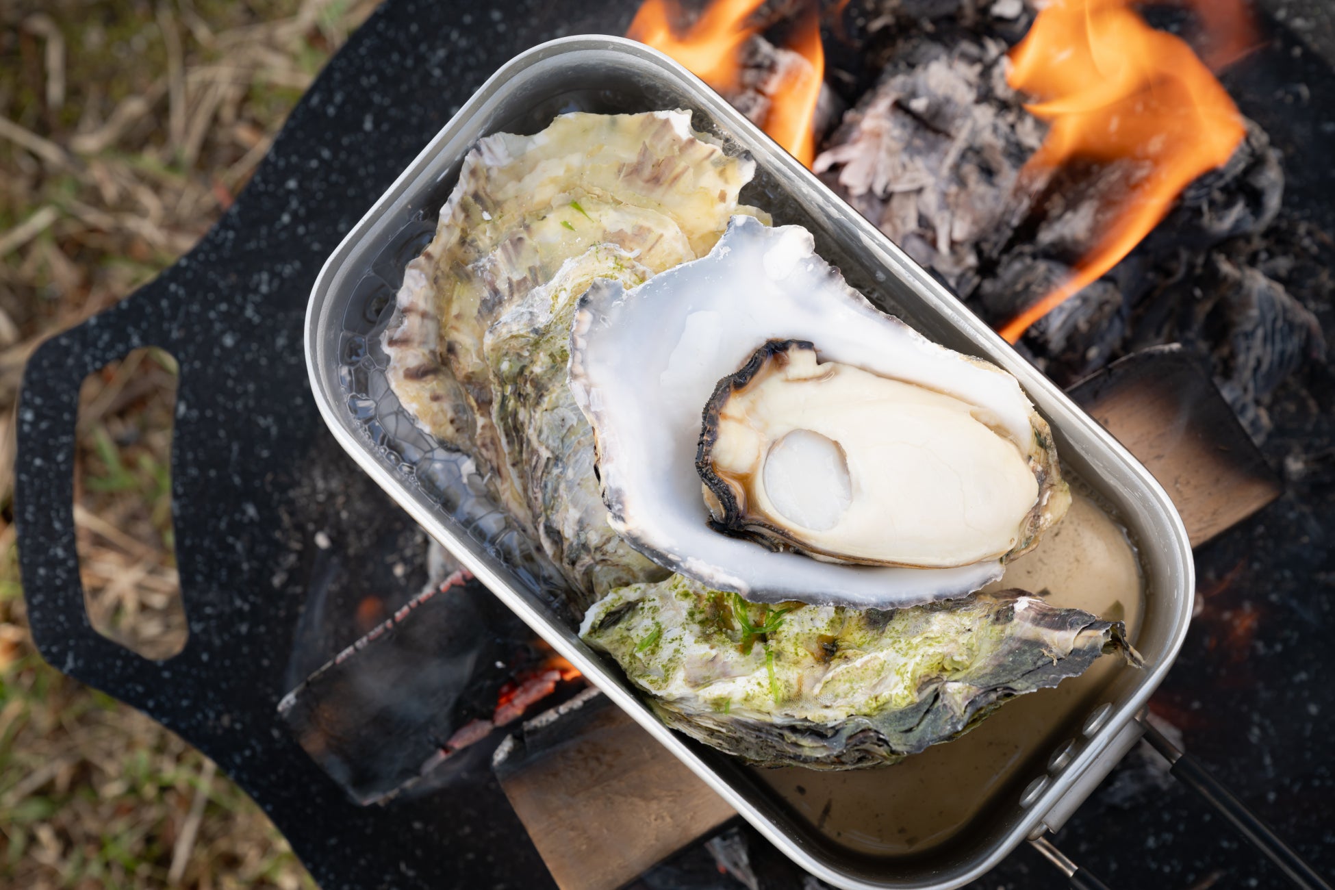 エメラルドグリーンに輝く穏やかな的矢湾は、豊富なプランクトンに恵まれ、美味しい海産物が獲れることで有名です。特にこの豊かな海で育った「的矢産牡蠣」は、ふっくらと柔らかく艶やかで、甘味・旨味・塩味のバランスがちょうどよく、品の良い味わいであることから、皇室にも献上されている由緒ある牡蠣としても知られています。特におすすめの食べ方が、漁師料理のかんかん焼きです。牡蠣を入れた缶を直火にかけ蒸し上げることで旨みが凝縮され、濃厚な味わいをダイレクトに楽しめる一品です。