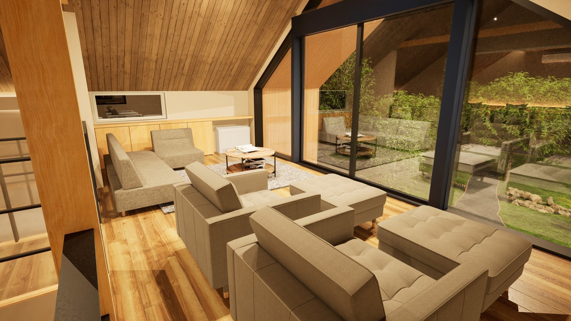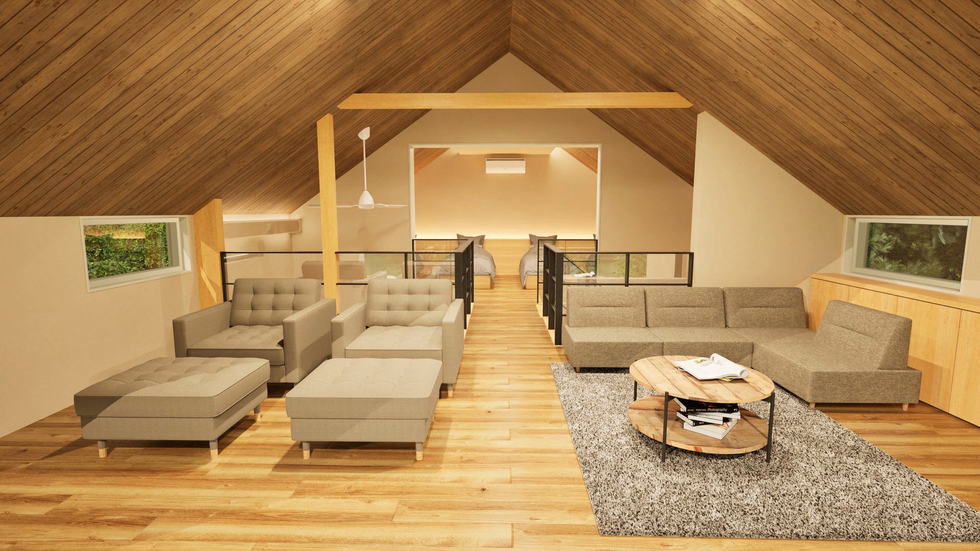 2階部分にあるリビングスペースでは、阿智村の澄んだ空に広がる満天の星を楽しんでいただけるプライベートリビングをご用意しました。ソファに身をゆだねながら星々の輝きをゆっくりと堪能する時間はここだけの特別な体験。まさに非日常のひと時をお届けします。