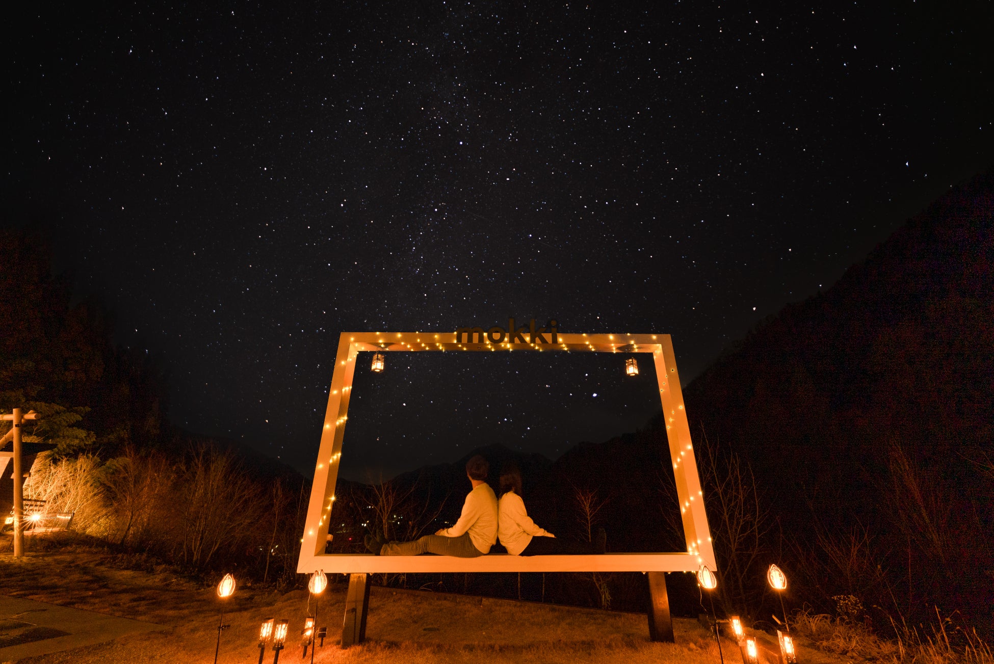 20時30分前後には全施設の照明を落とす大人気の星空観測タイム。⽇本一の星空をバックに記念撮影ができる大人気のフォトスポットでスタッフが記念撮影を実施。大切な方との心に残る特別な時間を演出します。 星をテーマにした北欧風ラグジュアリーグランピング【mökki STARDUST GLAMPING achi village】手が届きそうな無数の星々が輝く星の村で、非⽇常のグランピングをご体験下さい。