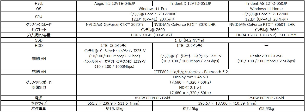 スリム筐体に高性能パーツを搭載しており、熱源を独立した区画に配置し効率的な冷却性能を実現することで、高性能・冷却性・コンパクトの3要素を実現したゲーミングPCとなっており、設置場所を気にせずに快適なゲーミング環境を構築したい方へお勧めのモデルです。「Trident X 12VTD-051JP」は、最新の第12世代インテル® Core™ i7-12700K、Nvidia® GeForce RTX™ 3070 LHRを搭載したミドルハイクラスで、「Trident AS 12TG-050JP」は、最新の第12世代インテル® Core™ i7-12700F、Nvidia® GeForce RTX™ 3060Ti LHRを搭載したミドルクラスとなります。何方のモデルもゲームや配信等の高負荷な作業をストレスなく行うことができ、M.2 NVMeタイプのSSDを採用することでゲームの起動やロード時間を大幅に短縮でき、付属している交換用の強化ガラスパネルと本体のイルミネーション機能を組み合わせることで煌びやかなゲーミング環境を構築できます。