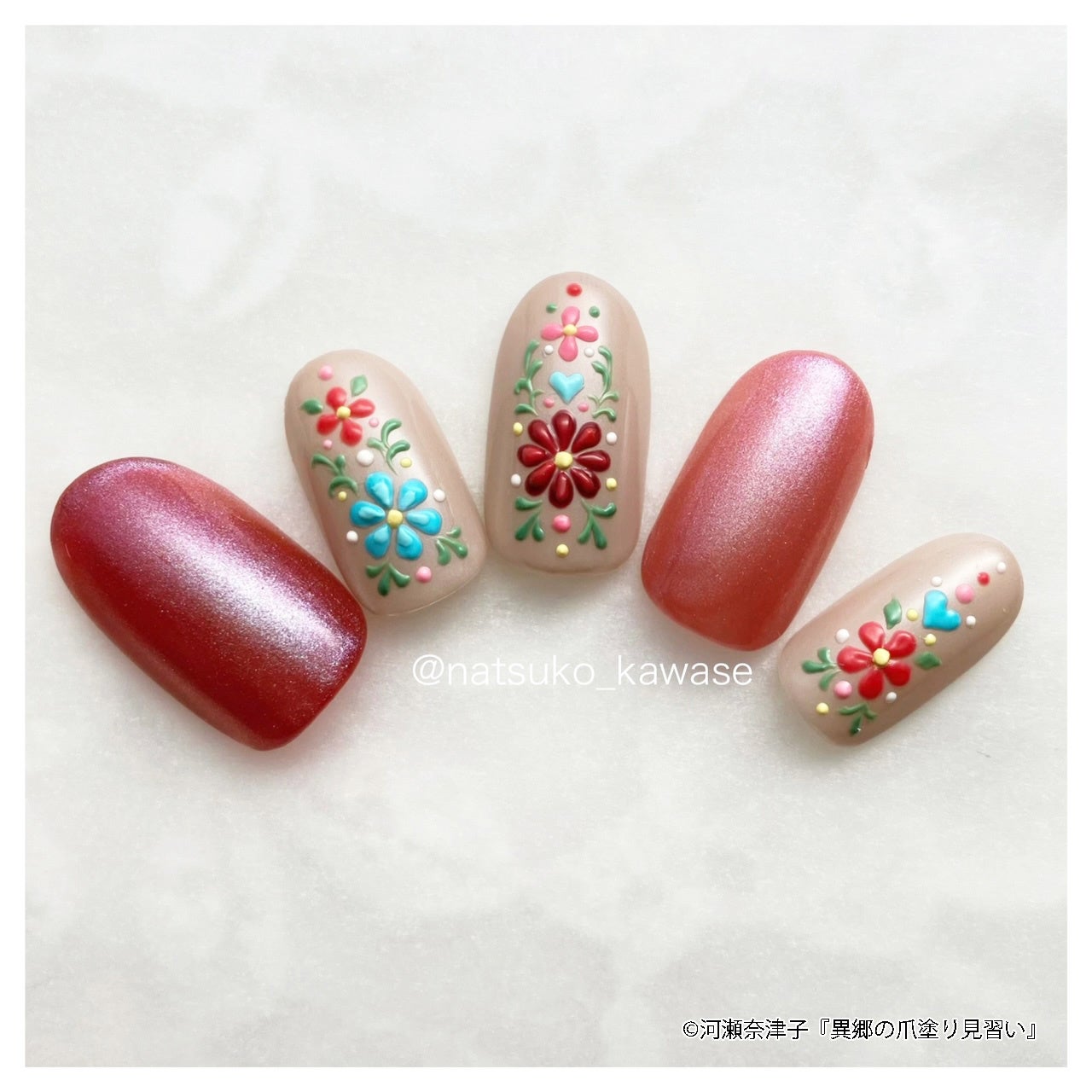 異郷の伝統刺繍をイメージし、河瀬氏の得意とする繊細なデザインがぷっくり立体的に描かれた小花模様のネイルが、ほっこりとあたたかみのある可愛らしさで作品世界を彩りました。