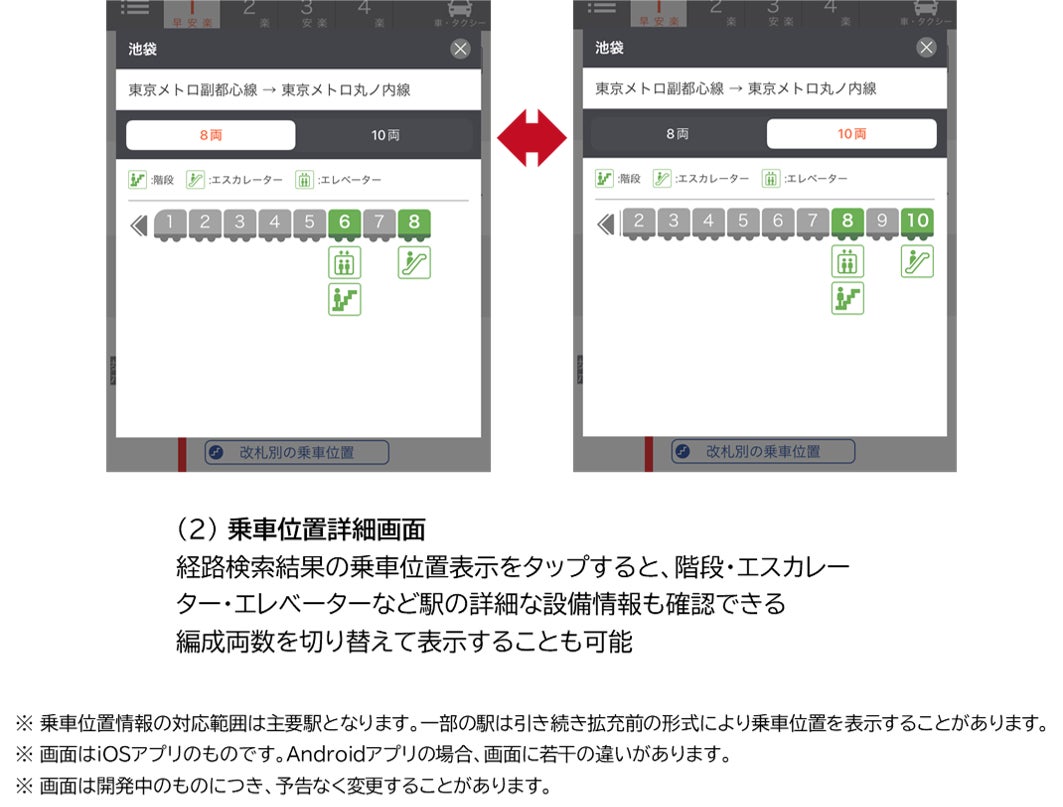 さらに、「乗車位置詳細画面」では、到着駅ホーム上にある「階段」「エスカレーター」「エレベーター」などの設備の詳しい位置を確認することもでき、より快適な移動をサポートします。