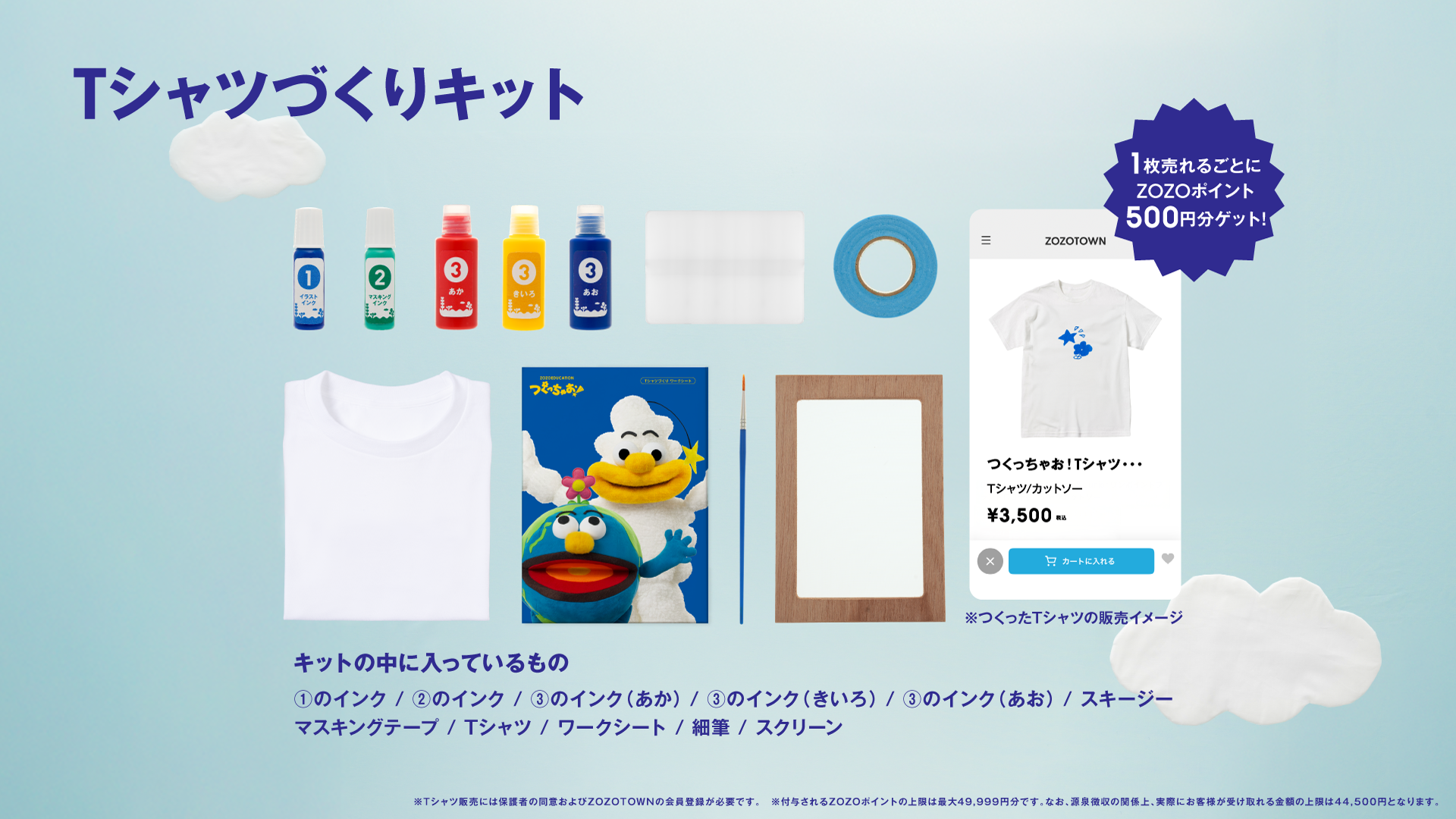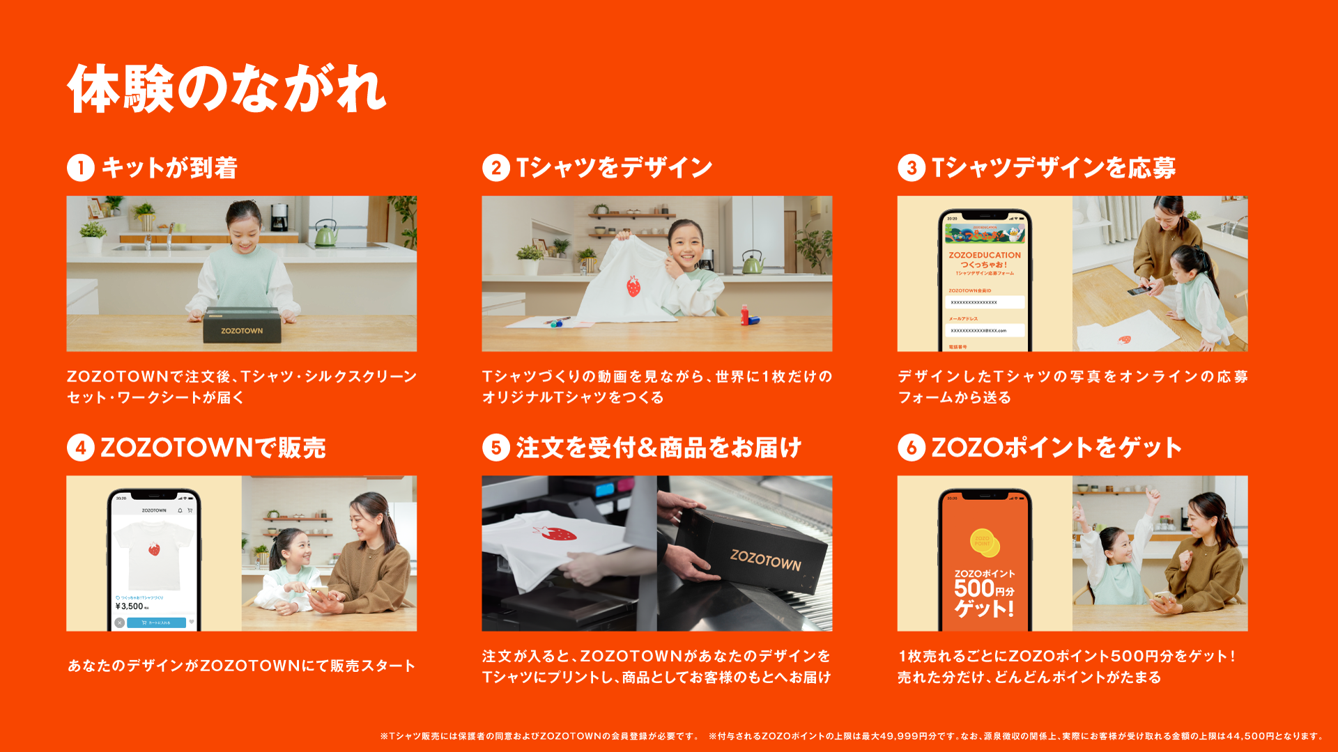 本プロジェクトの一環として、Tシャツのデザインから販売までを、親子が自宅で気軽に体験できるTシャツづくりキットを3月25日(水)より販売開始します。キットには、Tシャツ本体やシルクスクリーンセット、レクチャー動画など、Tシャツづくりに必要な基本アイテムが揃っており、はじめてでも楽しくチャレンジできる体験設計となっています。絵を描き、色を選び、刷るというものづくりのプロセスを通じて、「考えること」「表現すること」「つくる楽しさ」を自然に学ぶことができます。また、本キットの最大の特長は、完成した作品を実際にZOZOTOWN上で商品として販売できる点にあります。年間購入者数1,200万人を超える(※2)ZOZOTOWNという“社会の場”で、自分のデザインが並び、選ばれる体験を通じて、子どもたちは創造力や主体性、社会とのつながりを実感できます。さらに、販売された作品1点につきZOZOポイント500円分(※3)が付与され、自分の作品が誰かに届き、認められる体験にもつながります。(※4)