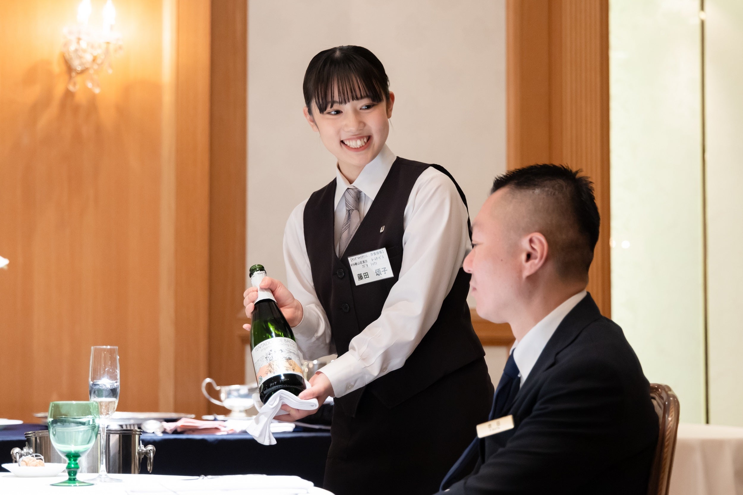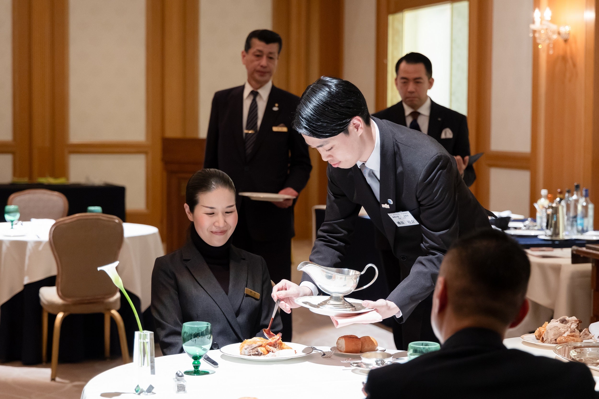 接客部門では、お迎えからテーブルの片づけまでの一連の流れのなかで、お客さまを意識したご案内や立ち居振舞い等が審査されました。海外からのお客さまにも質の高いサービスを提供できるよう英語での接客も審査対象に含まれるほか、審査の最後には「お客さまが求めるホスピタリティとは」「自身が大切にしているホスピタリティとは」というテーマでスピーチを行い、接客に対する熱い想いを感じることができました。