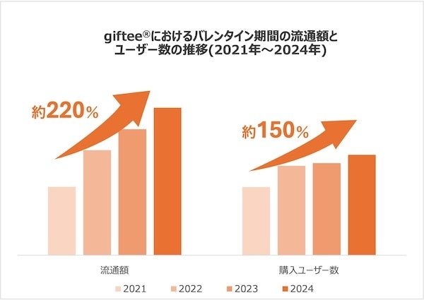 2024年のバレンタインデー期間(2/13~15)における「giftee®」でのeギフトの流通額は、2021年比で約+120%、2023年同期比で約+20%、eギフトを購入したユーザー数は2021年比で約+50%、2023年同期比で約+10%といずれも増加しており、4年間継続して右肩上がりに推移していることがわかりました。