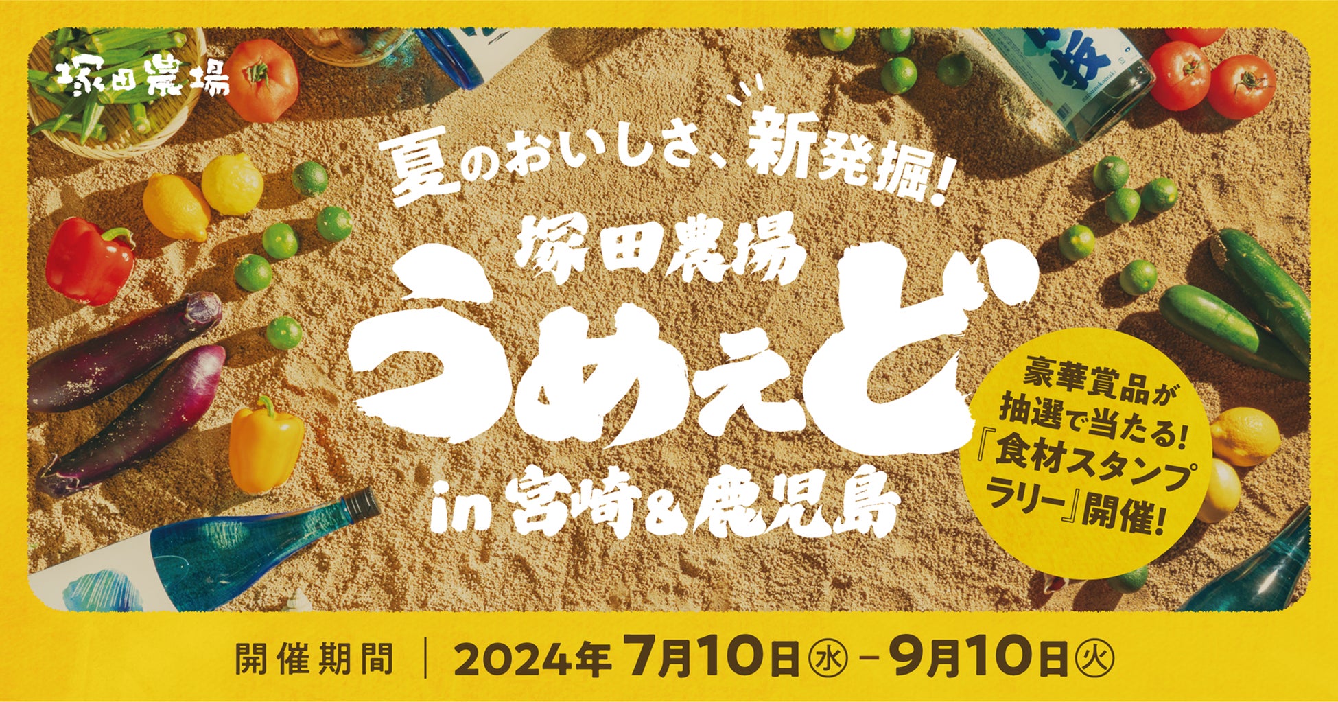 株式会社エー・ピーホールディングス(本社:東京都豊島区、代表取締役会長 兼 社長:米山久)が運営する「塚田農場」「炭火焼鳥 塚田農場」、および「日南館」では、2024年7月10日(水)より、宮崎県と鹿児島県の夏の味覚にフォーカスした期間限定の「うめぇど in 宮崎&鹿児島」をスタートします。また、同日より夏の食材を食べるごとにスタッフから貰える「うめぇど」シールを集めると、抽選で豪華景品が当たる「食材スタンプラリー」を開始します。