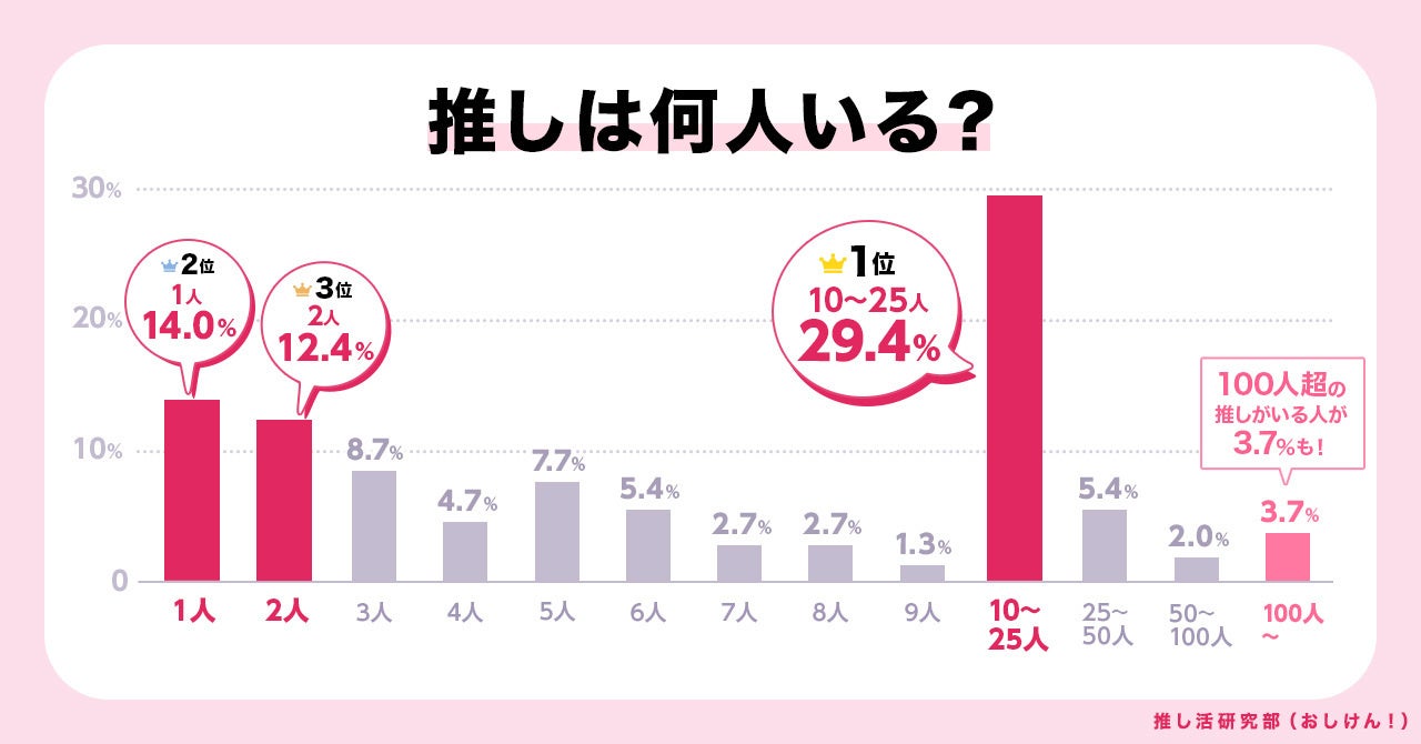 アンケートは、「あなたの推しは何人いる?」という内容で、ひとりだけ、2人、3人、4人、5人、6人、7人、8人、9人、までをひとり刻みで細かく分け、10人以降は10人~25人、25人~50人、50人~100人、100人以上というくくりで、それぞれ推しの数をユーザーに選択していただきました。アンケートで一番選択が多かったのは「10~25人」の29.4%でした。なお、次点で多かったのは「ひとりだけ」(14%)、3位が「2人」(12.4%)という結果になりました。