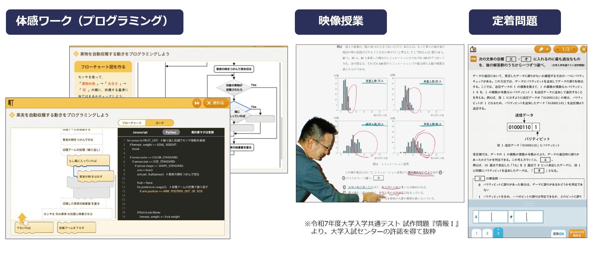 そこで、身近な事例から情報技術の背景を理解し、演習・定着まで行える教材を搭載しました。「情報社会の問題解決」「コミュニケーションと情報デザイン」「 コンピュータとプログラミング」「情報通信ネットワークとデータの活用」の4領域から幅広く出題されるため、全領域網羅しています。高配点が想定される「コンピュータとプログラミング」では、実際に動かしながら試行錯誤することで、自ら答えを導き出す実践的な力を身につけることができます。多くの学校で扱われているプログラミング言語の Python(パイソン)、 JavaScript 、表計算マクロ言語に対応しています。