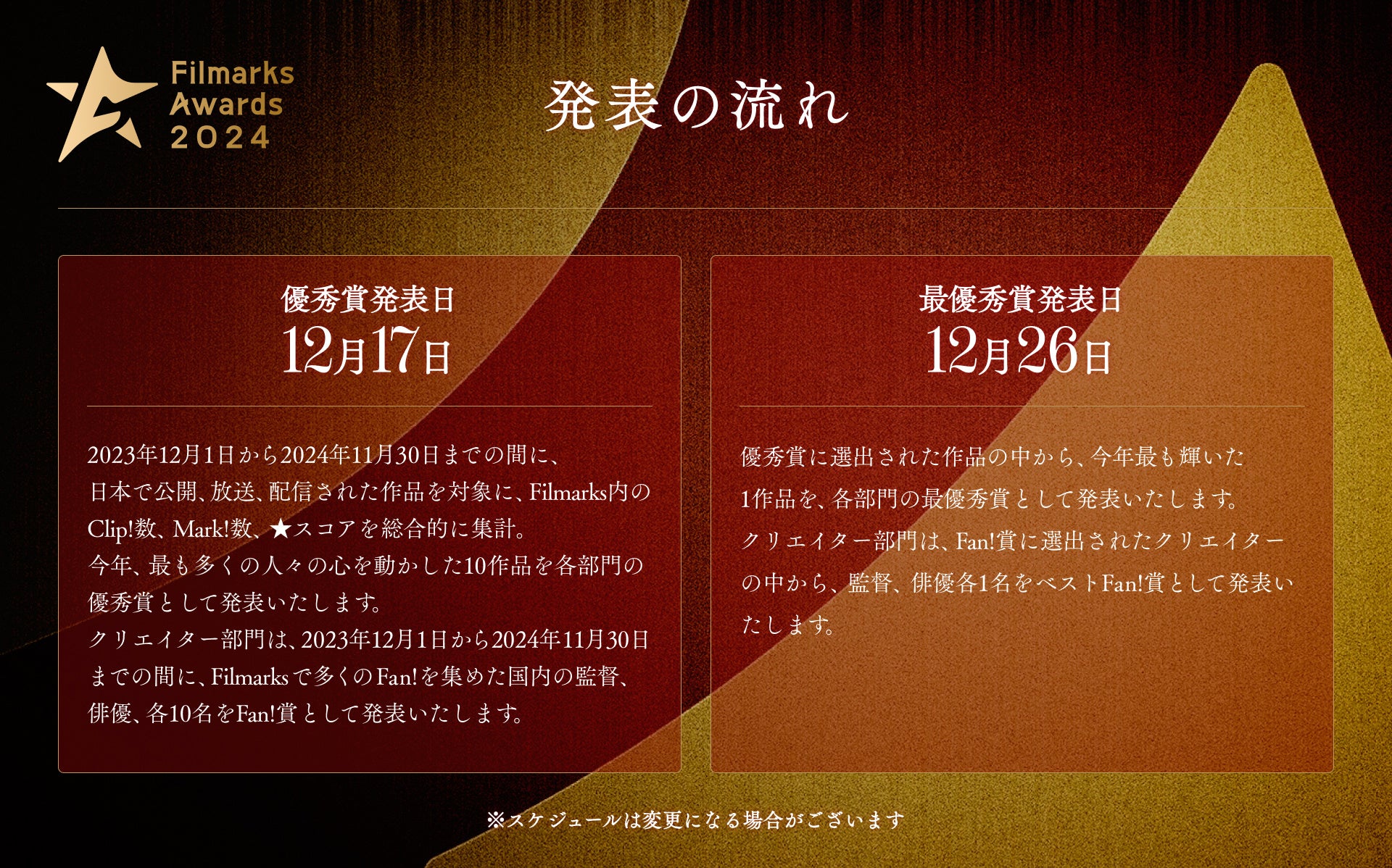 Filmarks内のClip!数、Mark!数、★スコアを総合的に集計し、今年最も多くの⼈々の⼼を動かした10作品を各部⾨の「優秀賞」として12⽉17⽇に発表いたします。