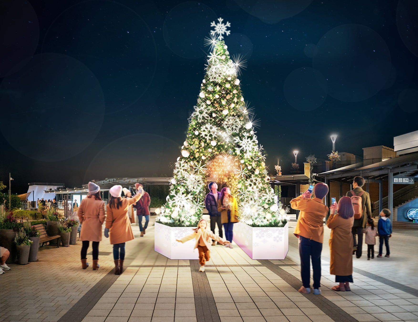 メインゲート前には赤とゴールドの色合いを基調としたクリスマスツリーがお出迎え。アーケードには天井から降り注ぐつらら状のイルミネーションが空間を華やかに演出。キラキラ煌めくメタル素材の壁面フォトスポットもお楽しみいただけます。場内各所、雪の結晶をモチーフにしたライトやシャンパンゴールドのイルミネーションに心が躍ります。