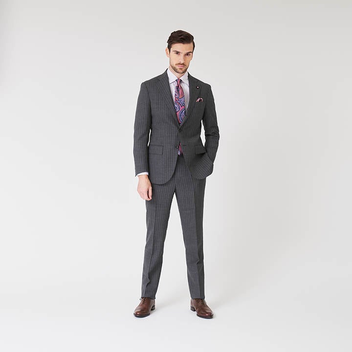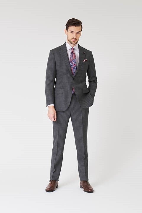 「ドーメル」社製で、環境保護とトレーサビリティが保証された「TONIK WOOL」を使用した、チャコールグレー地にベージュのストライプを織り込んだスーツです。正しい管理体制のもと生産されるパタゴニアウールの超強撚糸を織り上げることで、膨らみと光沢を持たせました。