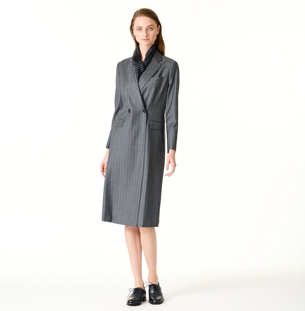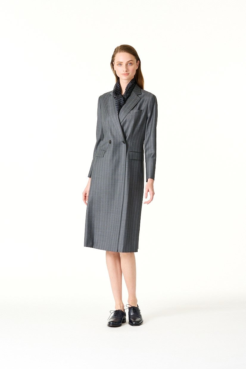 「ドーメル」社製の代表的な生地で、美しい光沢感が特徴の「AMADEUS 365」を使用したエレガントなコートドレスです。ウールを使用していますが非常に軽量で、その名のとおり365日を通して着用できます。イタリア生地のようなしっとり感を持ちながらも英国生地ならではの丈夫さを兼ね備えたバランスの良さが特徴です。