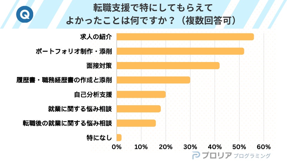 転職支援で特に満足したのは「求人の紹介」(56%)と「ポートフォリオ制作・添削」(52%)
