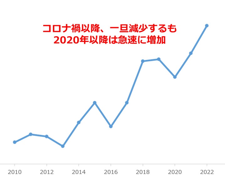 新型コロナウイルス感染症の位置付けが「5類感染症」に移行し、これまで講じてきた様々な制限が一定程度緩和されています。2022年以降、訪日外客数(※1)や日本人の国内旅行消費額(※2)は回復傾向にあり、2023年1月から3月期の国内の宿泊旅行消費額も3兆4,469億円(※2)と前年に比べ大きく増加しています。そのため、2023年のホテル・旅館業界の売り上げは2019年と同等、またはそれ以上が見込まれます。